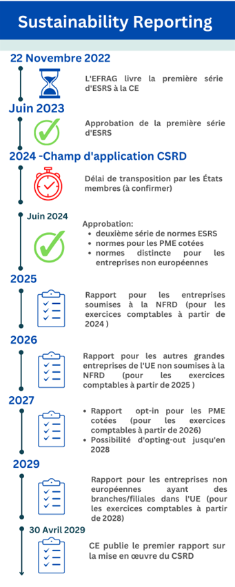 Il ne faut pas oublier qu’avant d’être applicable en Belgique, la CSRD devra d’abord être transposée dans la législation belge. Vous trouverez ci-dessous une ligne du temps qui reprend les grandes échéances imposées par la CSRD :